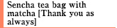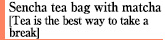 Recommended as a small gift. It has a triangular shape that makes it easy for the tea leaves to spread out, and since it also contains matcha, it is not only fragrant but also has a deeper flavor.