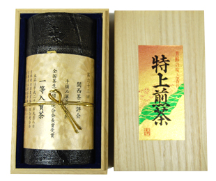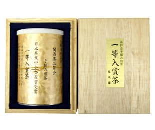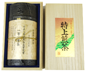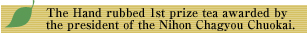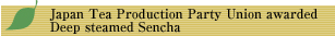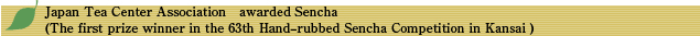 This is Japan Tea Production Party Union awarded the first prize winner in the 63th Hand-rubbed Sencha Competition in Kansai where held in head tea market of Kyoto prefecture tea cooperative association in 8th September 2010. There are 55 Deep Steamed Sencha exhibits in this year. Our company's president and executive participated and successfully bid Japan Tea Production Party Union awarded the 1st prize Deep Steamed Sencha . This sencha is made by Mr. Hideki Yoshida in Mathuzaka city. Participation in the competition starts from fertilizing the soil, paying special care for their honor. First, the farmers enrich the soil with organic fertilizer. After two years, when the soil has become rich enough, they plant cuttings. They rear the plants for about three years. When young leaves sprout, they pick the leaves. Freshness is one of the most important factors for the taste of green tea. Dozens of veteran farmers pick the leaves in the shortest time and the leaves are deep steamed as soon as possible. The experts rub the steamed leaves to dry.. Teas are examined from four points of view: aroma, shape, taste, and color of water. This product scored the highest marks in all four categories (197points). Brew it at lower emperatures(75?Z). It gives water a deep green color, sweet aroma like a gyokuro and delightful taste. Just one sip gives a sense of satisfaction. This is a blissful tea