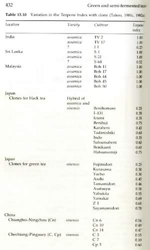 テルペン指標と呼ばれるこれらのアルコールの割合(リナロオール/(リナロオール+ゲラニオール)で香りによって緑茶の葉の違いを見ることができます。それぞれ緑茶の葉ののテルペン指標の表は次の通りです。