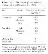 煎茶は日に照らされて育ちますが玉露と抹茶は覆いをかぶされて育ちます。覆いにかぶされて育った玉露と抹茶は独特の甘いにおいがします。玉露のにおいは日陰でそだったて茶葉の木に蓄えられたSメチルメチオニン(アミノ酸)の温度分解によるジメチルスルフィドによってもたらされます。緑茶のジメチルスルフィドとSメチルメチオニンの含有量の表は、右の通りです。
