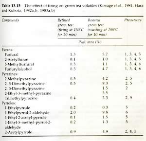 緑茶は製茶されてから火入れ(乾燥)されるので火入れの香りがします。火入れの香りのもとの物質はピロールとピラジンです。これらの物質は火入れ(乾燥)のときにお茶の葉の中のアミノ酸と糖分からできます。最も重要な火入れのにおいのもとの物質は2,5ディメチルピラジンと1エチルピロール2アルデヒドです。これらはLアルギニンとDグルコーズトLテアニン、Dキシローズから作られます。火入れの良い茶の葉はアミノ酸を多く含んだ葉からえられます。お茶の成分の火入れの効果の表は右の通りです。