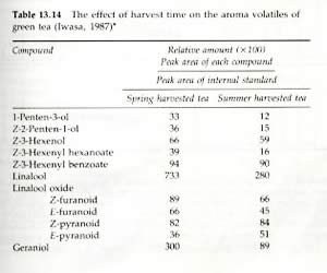 お茶の芳香成分の元は、モノテルペン アルコールです。このアルコールは茶の木の生育中にたくわえられたグルコサイドからできます。お茶の葉の中のモノテルペンアルコール特にリナロオールとゲラニオールの含有量がお茶の芳香を決めます。