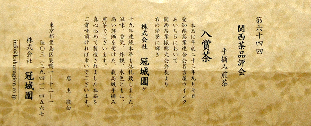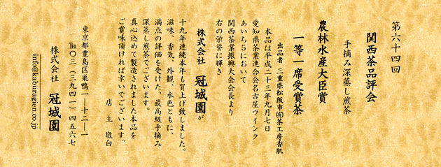 本品は平成23年9月7日、愛知県名古屋市 ウインクあいちにて行われた、第64回関西茶品評会手摘み深蒸し煎茶 農林水産大臣受賞一等一席茶です。