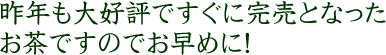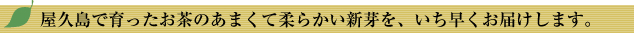 一番新茶 日本一早い! 世界遺産屋久島 神々の棲むという屋久島で取れた日本一早い新茶です。屋久島の茶畑から摘まれすぐに鹿児島へ、ここで製茶され空輸便で東京巣鴨の冠城園に到着、すぐに袋詰めしました。 生産家と産地製茶問屋と消費地との信頼と深い絆で最速便でお届けする、深蒸しのおいしいまごころ新茶です。 “初物は命も伸びる”と言います。 日本一早い、一番新茶をぜひお楽しみください。
